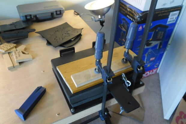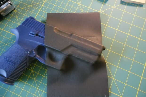 También mientras se está calentando el kydex, a veces utilizo un trozo de madera para crear un "canal de sitio" en kydex. Así la vista no causa la mira delantera de la pistola real para "atrapar" en la funda durante su sorteo. Bueno, ahora que el kydex es caliente, sacar del horno y colocarlo en la prensa. Ojala, que tenía un plan de posicionamiento todo antes ahora! Entonces, usted pone el kydex caliente en la prensa, y luego pone su arma azul en la parte superior en la posición que usted ha decidido. Siempre coloco un trozo de MDF o madera encima de mi pistola azul para mayor presión para mejor definición en el kydex. entonces rápidamente Coloque la parte superior de la prensa en su lugar y cierre herméticamente. Compré mi prensa de Knifekits.com. Sin embargo usted puede hacer fácilmente una prensa por su cuenta. Entonces usar algo de madera junto con abrazaderas buena realmente añadir algo de presión. Ahora, tiempo para relajarse... unos 15 minutos mientras que los moldes de kydex alrededor de su arma y se enfría y endurece.