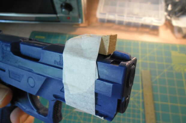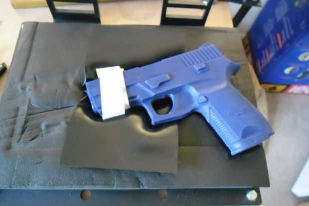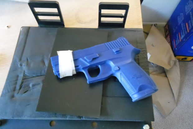 Nota!!!!!! Si usas un arma real en su prensa, necesita ser consciente de algunas cosas. Primero, seguridad! Asegúrese de que el arma está descargada! Tire de la cerradura de la diapositiva abrir e inspeccionar y revista! Si se trata de un revólver, hacen pivotar hacia fuera el cilindro para asegurar que no están munición real allí. También, si usted posee un arma de armazón de polímero, digamos, una Glock, calor + presión es malo!! Ha habido informes de dummies poniendo sus pistolas de armazón de polímero en la prensa, sólo para descubrir más tarde que sus revistas serán NOTgo en el arma más de largo. DUH! En esta situación ir a su tienda local de artículos deportivos o gunshop y comprar algunos "snap caps" para cargar en tu revista. Entonces se puede colocar revista en su arma y protegerá su marco de deformación. ---El aviso ha sido emitido.