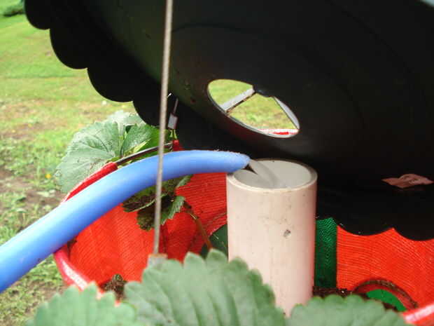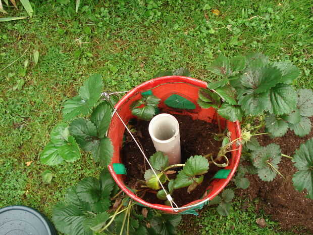 . Este cuadro demuestra la primera vez que usé un Topsy Turvy. No crecer cualquier fresa que realmente podría comer. Comenzó a darse cuenta de algunas cosas como la temporada de cultivo fueron a lo largo. La primera cosa que noté fue la temporada fue en el suelo en la parte inferior de las patas tiene realmente duro y compactado. Aunque utilicé muy buena tierra con turba y milagro crecen a, todavía sería conseguir compactado. Así regaba. El agua sólo conseguiría hasta a medio camino abajo el Topsy Turvy así que no todas las plantas eran conseguir alimentos y agua. Así que se me ocurrió una idea y trata de cómo funcionaba hacia fuera.