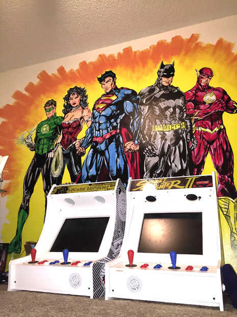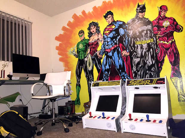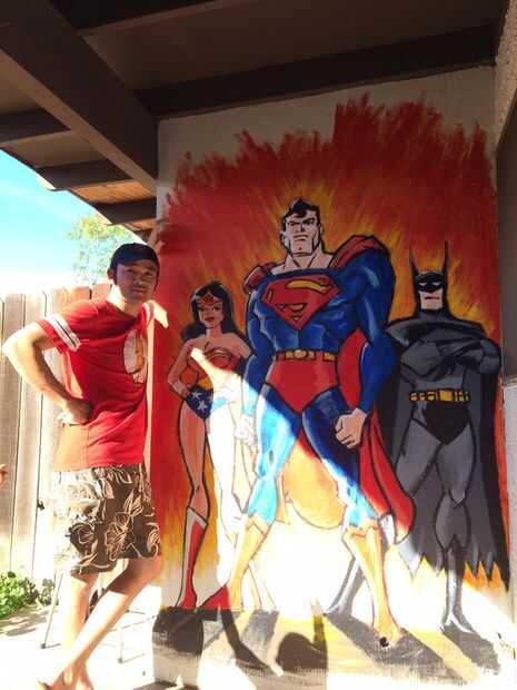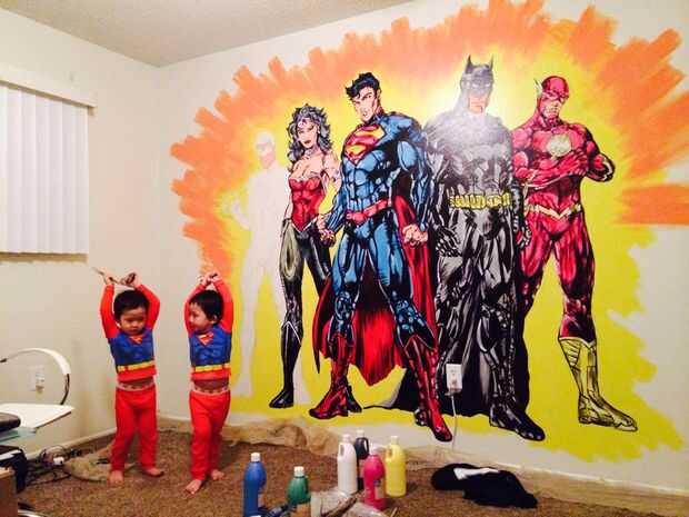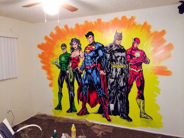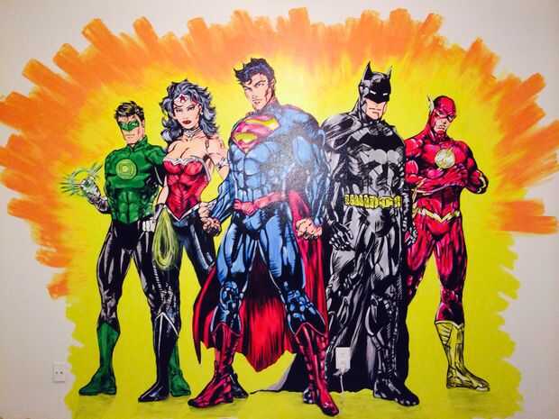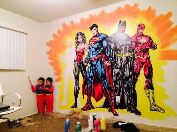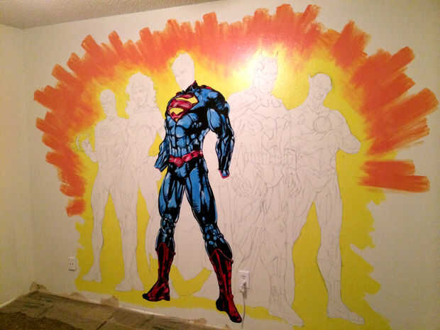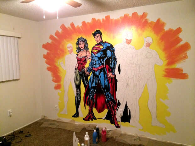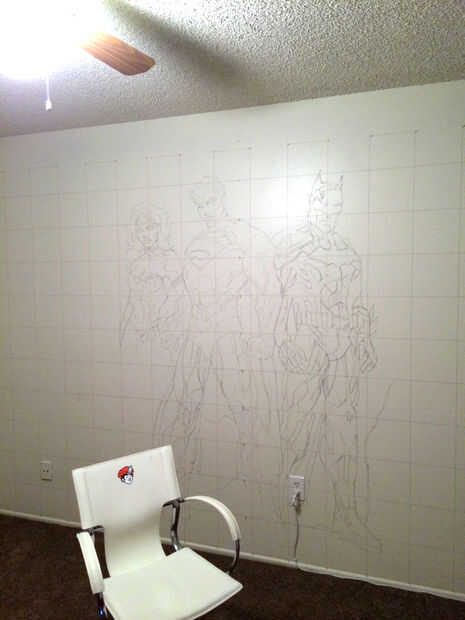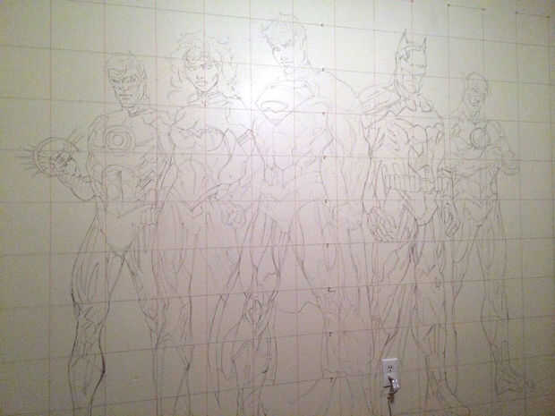 Acaba de terminar el Mural de la Liga de la justicia en un 8' - 0" x 12' - 0" pared de la sala - con un pequeño dibujo y pintura habilidades, una carga de la nave del tiempo, paciencia y determinación, cualquiera puede hacer este mural... por supuesto, si realmente tienes las destrezas para dibujar y pintar de memoria (que es un gran compromiso), no tienes que crear la rejilla; pero este proyecto es para los curiosos y arte inspirado en las mamás y los papás que tiene mucho tiempo en su pesebre - este método te dará bastante el mismo resultado que su talentoso amigo o vecino - sólo toma un poco de coraje y un poco de un impulso inspirador para comenzarla...