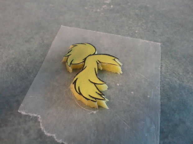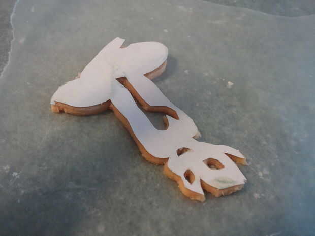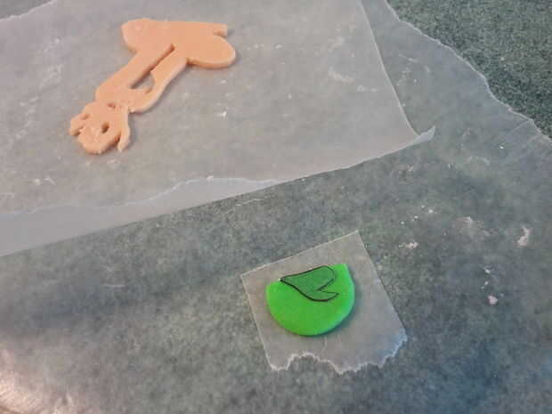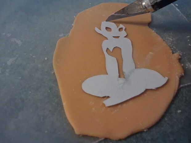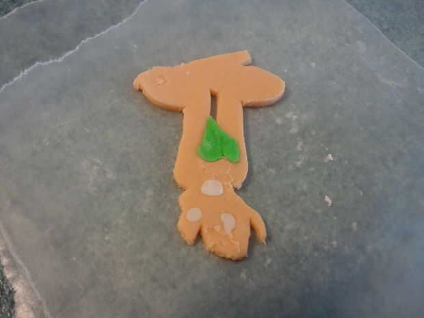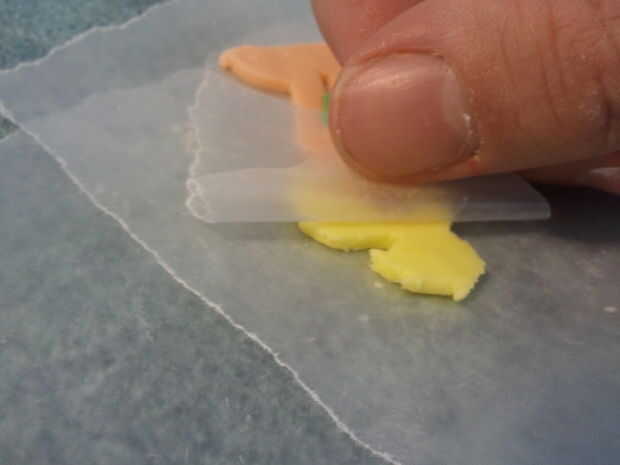 Elegí empezar con la parte más grande (la piel), dar la vuelta la plantilla boca abajo sobre el fondant de color correcto. En un pequeño trozo de papel de cera, trace el borde de la plantilla con un cuchillo y tirar a la basura. El resto de la plantilla se va a recortar el lado derecho hacia arriba y luego usted puede voltear en su posición. El fondant sólo debe tener suficiente palo así que puede sostener que el papel encerado arriba abajo it será no caer apagado. Pero cuando usted pela el papel de cera, en un ángulo agudo sale. Como no aplasta ni deforma el fondant, debe salir casi exactamente como la imagen.