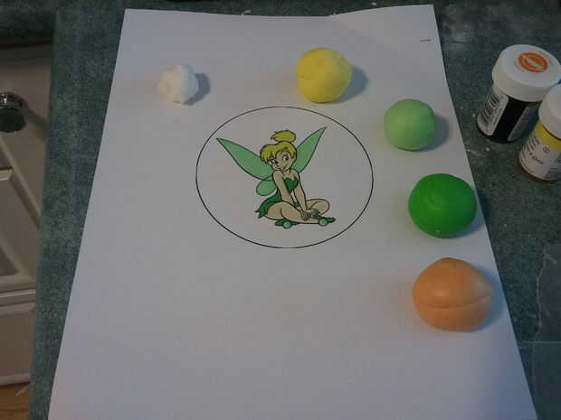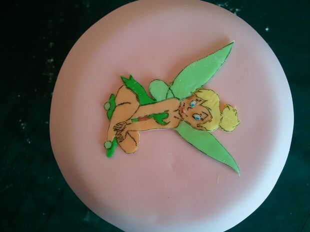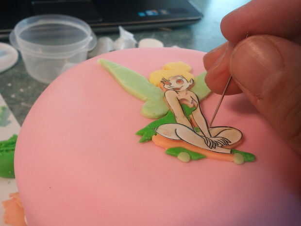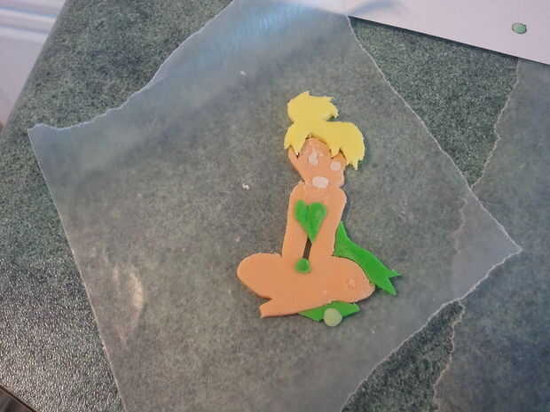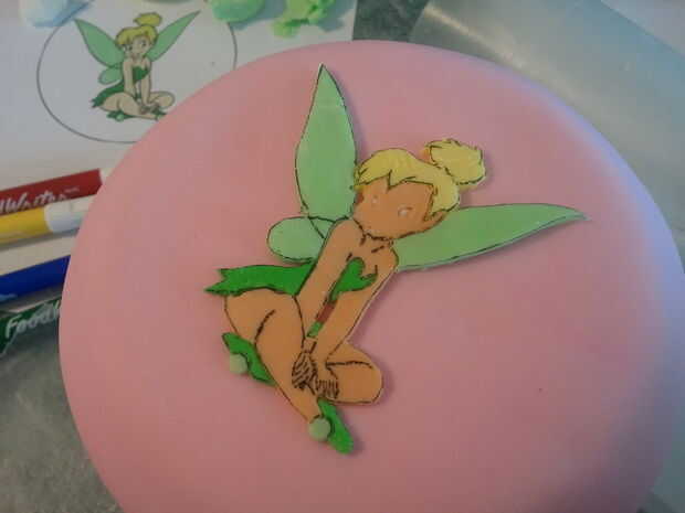Quise poner una imagen de campanita en la parte superior de la torta. Encontré una imagen que me gusto en la red, lo escala e imprime dos veces. Uno de los grabados corté aparte para separar los colores. A veces ayuda a imprimir una copia espejada. Mezclé colores se asemejen los colores en la impresión.
