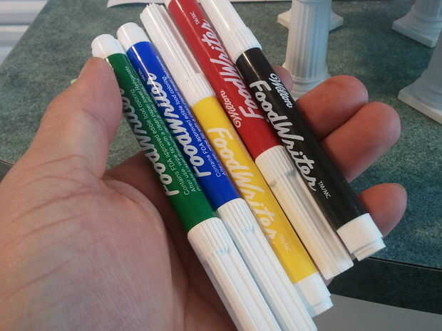 Luego usé mi marcadores de alimentos (estas cosas son impresionantes!) para poner en líneas negras, labios rojos y ojos azules. Para las áreas que necesitan negro líneas en medio de un color, como las líneas de la pierna y las manos, asomó los agujeros en la impresión con un alfiler sobre un trozo de cartón (si lo haces en el fondant aplasta hacia abajo antes de él perfora) una vez que los agujeros puede ponerlo en el fondant y palillo suavemente el perno a través de los agujeros para hacer pequeñas marcas. Entonces es sólo una cuestión de conectar los puntos con el marcador. Tenga en cuenta mi técnica en uno de los cuadros utilizando una caja y dos manos para apoyar el marcador tan constante como sea posible.
