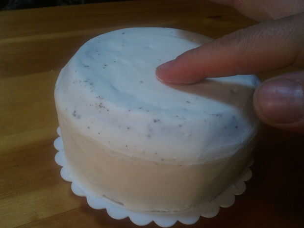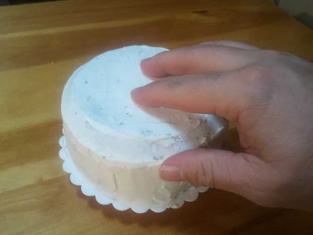 Saque el pastel del congelador y enseguida empieza a frotar el hielo con los dedos. Yo fingir que furiosamente estoy marcando un teléfono rotatorio pequeño. El calor de sus dedos será suavizar y alisar la guinda. frote hacia abajo de la torta entera hasta llegar a un final razonable. No tiene que ser perfecto pero que no hay puntos bajos importantes ni golpes.