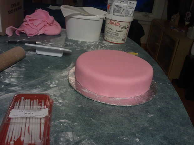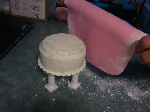 Una vez que el fondant sobre el pastel. No volver atrás en el congelador. Si hace el fondant suda o recogerá la condensación e ir goopy. La nevera está bien ahora.