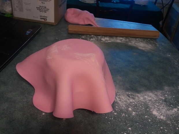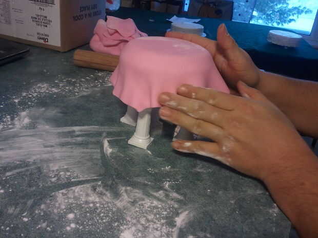 Corte y masaje suavemente el fondant. El objetivo es cambiar la forma del pastel con sin pliegues. Este requiere tiempo y práctica tan hasta dominarlo, pretenden tener los pliegues en la parte posterior de la torta. Yo uso un cuchillo del exacto para cortar el hielo sólo porque es el más agudo por lo que tira menos que otros cuchillos.