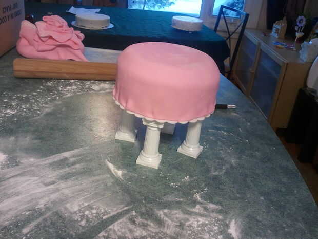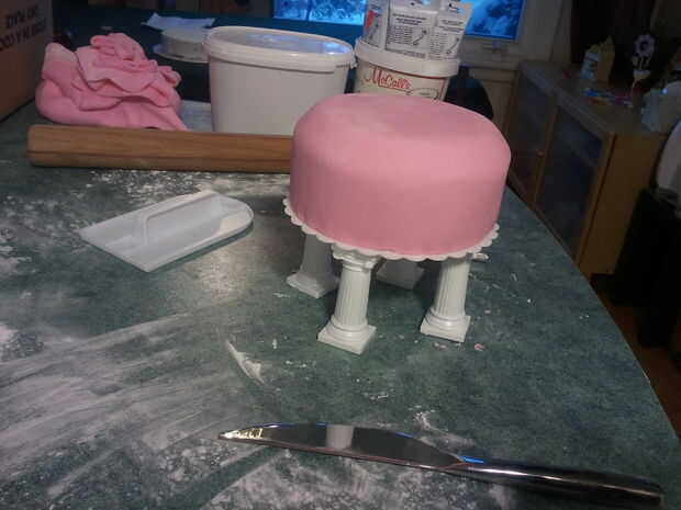 Una vez el tamaño y grosor que desee, rollo 3/4 o así sucesivamente el pin como en uno de los cuadros incluidos. Establece el borde justo debajo de la parte inferior de la torta y el perno del rodillo en la parte superior de la torta y por el otro lado. Esto es más fácil de hacer si puedes subir el pastel un poco.