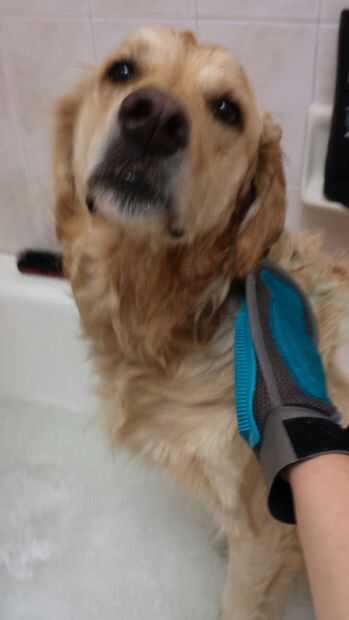 Ahora es el momento para la parte favorita de mi perro! Aplique una delgada línea de champú abajo de la espina dorsal de su perro, luego utilice los matorrales para frotar en forma circular y pasar agradable espuma. Mi perro le encanta esta parte porque es como un masaje! Asegúrese de que usted no consigue cualquier jabón en los ojos de tu cachorro! Se pueden también usar los dedos en vez de un guante, pero siento que ese tipo de cepillo realmente ayuda a conseguir un montón de la suciedad de su pelaje.