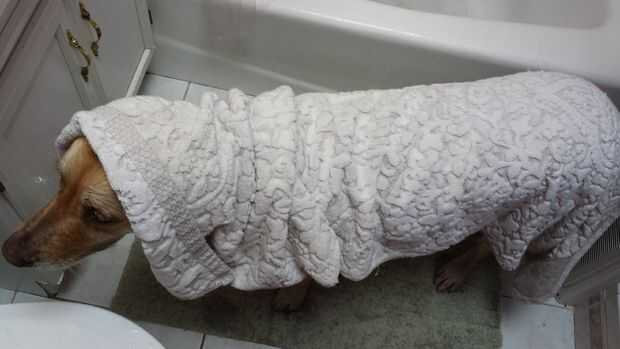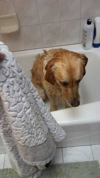 Antes de me deje perro de la tina, intento la toalla le fuera un poco así que cuando ella tiembla, ella no tendrá agua por todo el cuarto de baño! Una vez que ella está fuera de la bañera, yo cubra totalmente la toalla e intentar conseguir su tanta agua como sea posible.