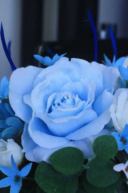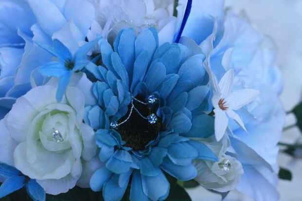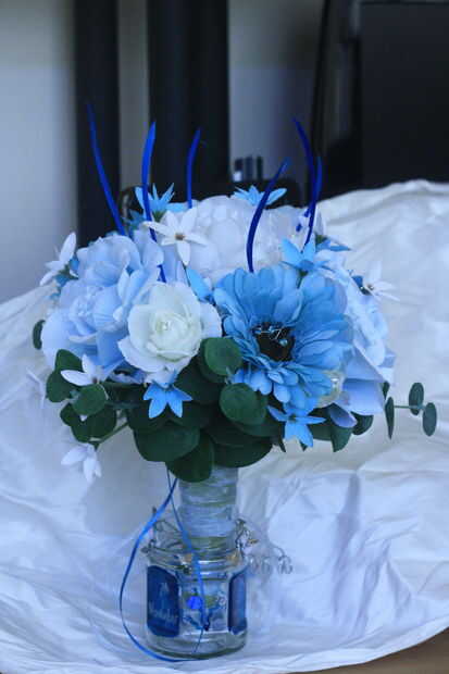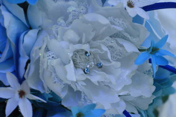 Yo y mi madre hizo el Ramos, que eran todo artificiales. Era más fácil conseguir que perfecto con flores de seda, y nos fuimos con la mirada sobrenatural, mediante la adición de rosas azules. También usamos pernos de diamente y ramitas diifferent colores a tono con la tela de Bridesmiads. Mi ramo era naturalmente un poco más grande y bien centrada con una gran rosa blanca lacey. Enlazamos todos los Ramos que usando el mismo teal y cintas de organza como antes, dejando pedacitos a decorativo. También encontramos algunos pato/pavo real azul que plumas millones. Poner el togther de flores era bastante simple, que nos mantuvimos a los números de magia de 1, 3, 5 y 7. racimos en estos números, y usted realmente no puede ir mal.
