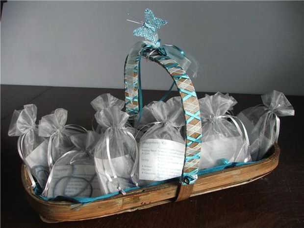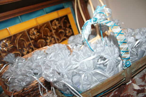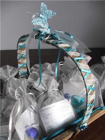 Nos subimos todos estos elementos en colores azul (principalmente de ebay) y luego de peluche en bolsas de organza plata. Luego decoré una cesta con las guarniciones restantes que debían mantener los favores.