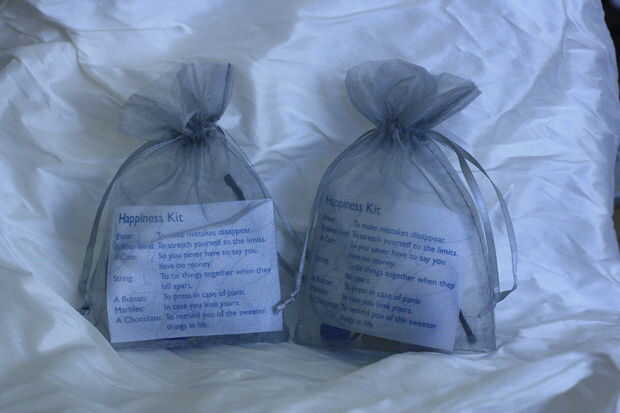 Así que aquí tiene una idea cheesey para boda... El Kit de la felicidad! Hemos encontrado esta idea en la web, y pensamiento fue un poco más interesante que su azúcar estándar revestido almendras! Jake imprimió el texto, usando nuestro logo y el mismo papel plateado que hemos utilizado para las invitaciones. El texto dice...