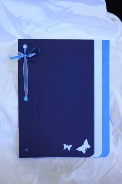El tema se continúa en el actual invita, con ojales diferentes colores (todos en azules y verdes) que sostiene las 3 hojas de papel/cartón juntos y atado con un lazo. También se encuentra algún agujero de mariposa Punzones de diferentes tamaños, así que utilizó esto como un motivo para mostrar las capas.