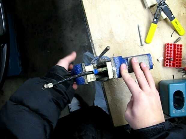 Deslice una arandela en el cable para que la presión salga limpiador. Hacer esto antes de que deslice en el conector. Este paso es muy recomendable porque sin él, la presión es muy difícil de hacer. El único problema con este paso es que te quedan con una arandela en el cable cuando haya terminado.
