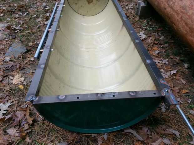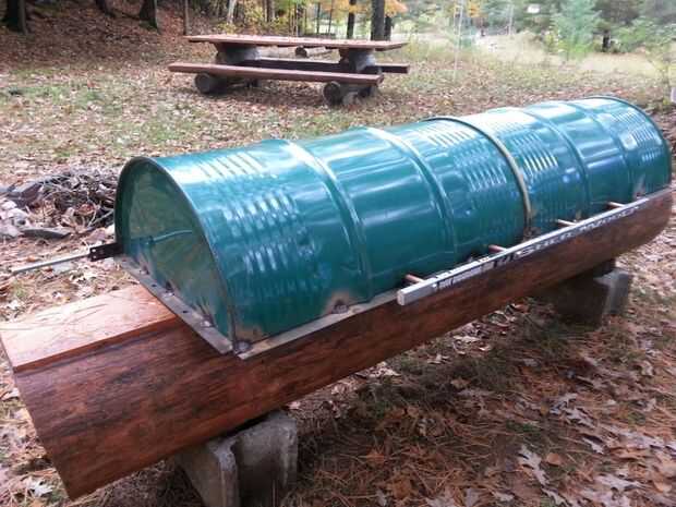 No de soldadura, pero gracias a Dios por amigos que lo hacen. (Tu el mejor Larry!) Se utilizan un viejo tambor alimenticia (corte por la mitad lo largo), algunos robaban-marco de la cama del hierro de ángulo y varilla roscada de 1/2" para preparar esta tapa con bisagras.