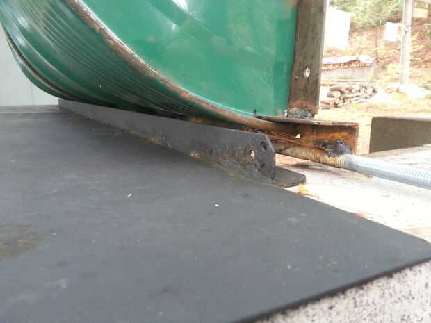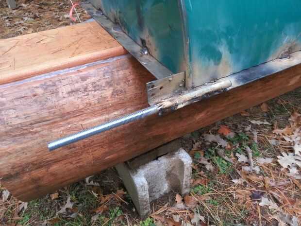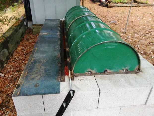 Para hacer la tapa girar nos soldada 12" longitudes de varilla roscada en la parte posterior de la tapa (en el refuerzo de hierro de ángulo). Este es alimentado en los soportes de la bisagra vertical en el lado de los bloques y asegurado con pernos, lo que permite una barbacoa completamente abierta cuando sea necesario.