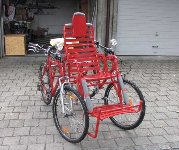 Como puede verse, asientos en la parte posterior y alto, en posición similar a las bicicletas comunes y mi esposa tiene un lugar en el frente, como en un carrito asiático... Hay algunos detalles que se terminó: defensas de guardabarros, pabellón, señalización, tronco en la parte trasera... Pero que deberá esperar a nuestro regreso de vacaciones en Belgrado, que comenzó en unos pocos días.