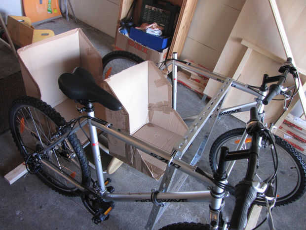 La segunda variante, con módulo entre bicicletas de madera Marcos, mi pedaleo y manejo en frente y mi esposa asientos en parte trasera – fue abundaban antes de terminar! Demostrado que mi posición no es tan bueno como esperaba. Aviso importante: al principio de la construcción – hacer modelo de palo de madera de sencilla y barata en tamaño completo para comprobar la posición de asientos, volante y pedalear!