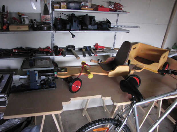 Herramientas utilizadas eran simples: eléctrica amoladora y taladro de mano eléctrico, después de la soldadura aparato (sólo para la fijación de nuevos pedales) y varios sencillas y baratas-herramientas de mano. En el piso, llamo de forma rectangular, de más fácil mantenimiento de la base recta del cuatriciclo, con palillos de madera adicionales para ayuda. No estuve trabajando solo, ayuda de "tercera mano". Algunas palmadas y tapón de cuerdas fueron útiles. El mismo - nuevo metal sillas que planeado para usar después de módulo madera central abundaban.