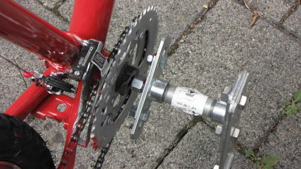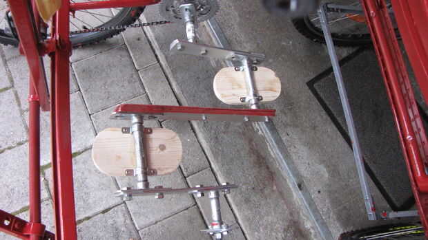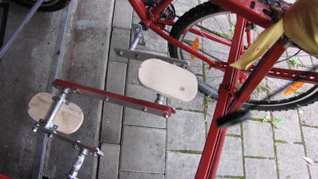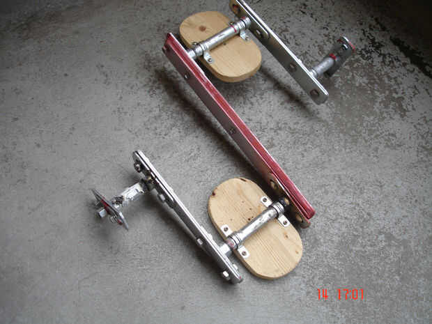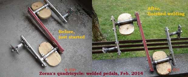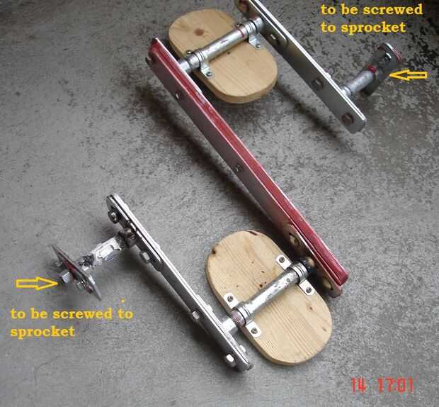 Decidí usar pedales DIY de simple eje inestable, conectados a ruedas dentadas delanteros (apretándolos en el lugar de pedales originales quitados). Durante las primeras pruebas, descubrí que atornillar no mantener bien el sistema, sin importar lo que he probado. Por lo tanto, compre barato aparato soldadura (regalo de mi esposa) y soldar todas juntas, en mi balcón. ¿Creo que las fotos son suficientemente descriptivas? Solo para agregar: barras planas son las tiras de aluminio 5 mm espesor 50 mm ancho. En el centro, hay dos tiras de madera contrachapada en sandwich de aluminio.