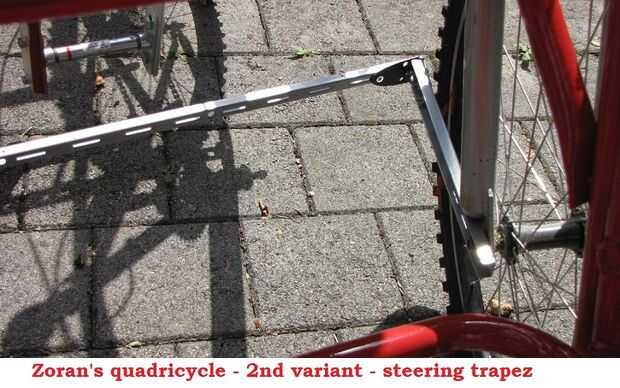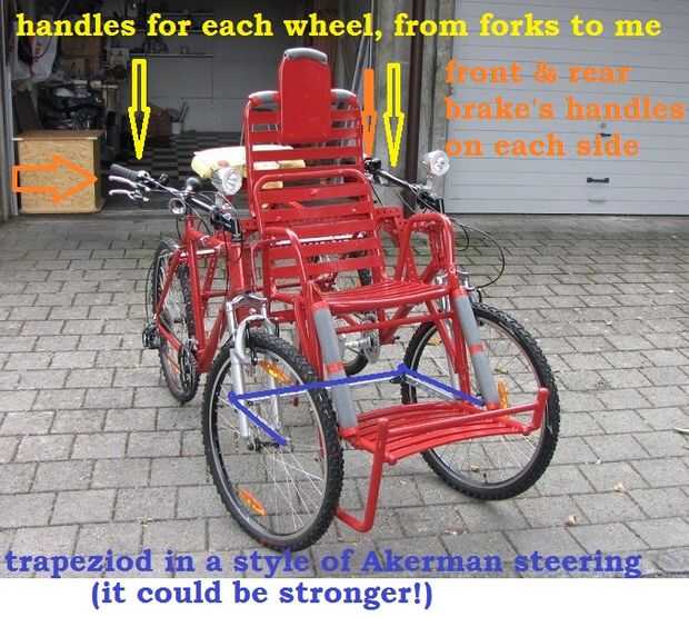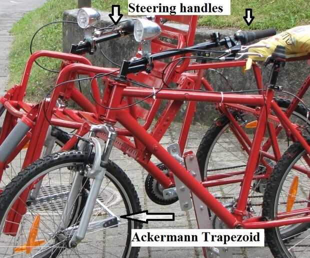 La parte principal del sistema de dirección son regulares horquillas MTB. Están conectados con trapecio en los puntos de fijación de eje – principios de Ackermann se obtiene.