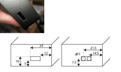 No tenemos mucho espacio en nuestro recinto, por lo que es importante el agujero para el conector USB está correctamente colocado. Cortar el agujero usando el método de elección - mina se muestra a la derecha, por un par de agujeros de 5mm de la perforación y luego presentarlos.