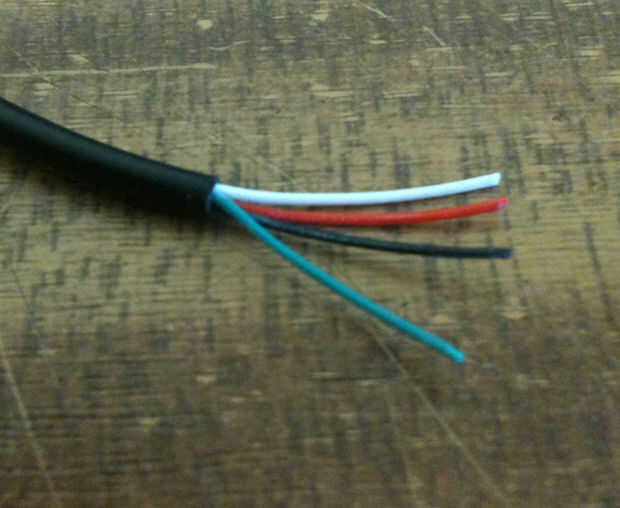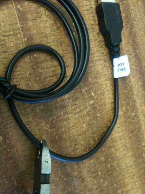 Con el cortador de alambre, corte el cable del conector USB A (el más grande de los dos conectores USB). Con el cortador de alambre o un pequeño cuchillo/bisturí recortar y eliminar unos 2cm del aislamiento externo del cable.