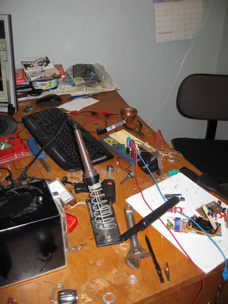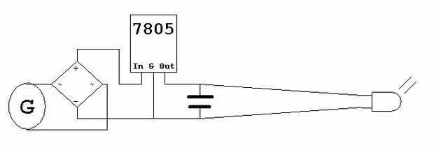Un rectificador, voltaje rgulator y un 0.47F condensador para hacer que los LEDs siguen resplandor después de la bicicleta ha dejado de moverse. Nueve luz brillante LED fue sacado de una linterna desechada y pegado de derretimiento en el reflector antiguo. La luz trasera tiene seis LEDs rojo pegados directamente a la tapa de plástico.