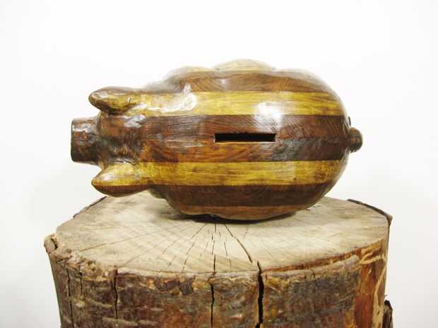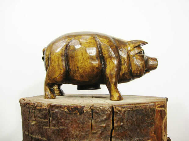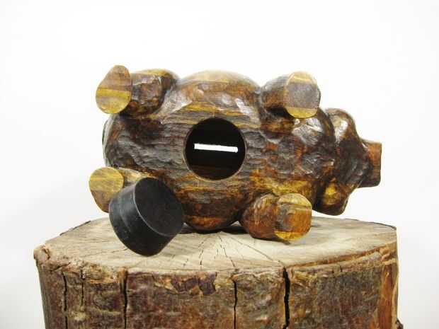 Está hecha de capas de tablas de pino de desecho que fueron cortadas, pegados encima, tallado abajo y acabada en el cochinito que ver aquí. Es aproximadamente 11" largo 6" altos y 6" de ancho, con un vientre cavernoso para sostener los fondos.