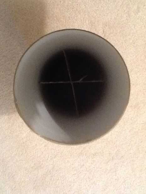 Deslizar y unir los dos pedazos de cartón grandes y asegúrelas con cinta adhesiva para que forman 4 ángulos congruentes. Y luego deslice la pieza en el recipiente de la lámpara de lava vacío.