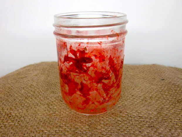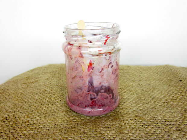 Añadir unas cucharadas de pegamento en un recipiente. Rasgar el papel de seda rojo en trozos pequeños y añadirlos a la cola. El tejido de la mezcla y pegar hasta que se convierte en una pasta de color púrpura. La mezcla de pegamento secará rojo, no púrpura.