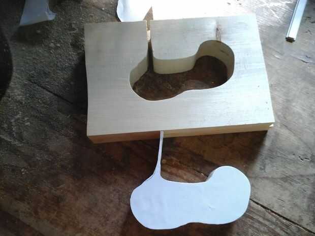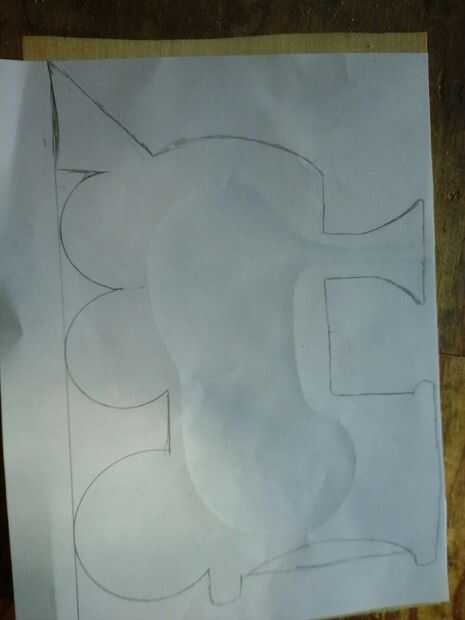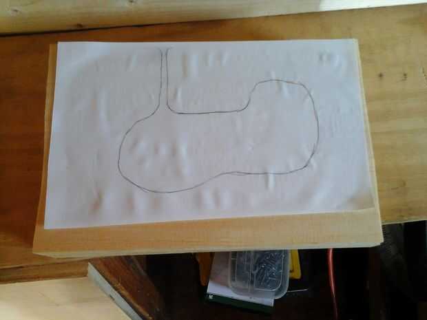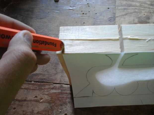 La ranura de moneda es en la chimenea del tren. El compartimiento es sólo una forma que cabe dentro de la silueta del tren. Pongo la plantilla de tren sobre el agujero para que pueda ver cómo se posicionará. Marca donde los bordes del papel están en la madera.