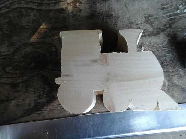 Primero, pegue las dos piezas restantes de madera a cada lado del compartimiento de la moneda. Coloque la plantilla de trenes en el bloque de madera. Asegúrese de que los bordes del papel se alineen con las líneas en el lado del bloque. Luego, córtelo hacia fuera y lo de la arena.