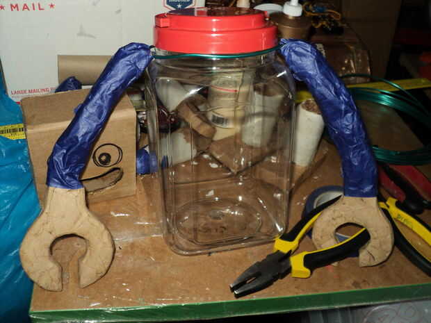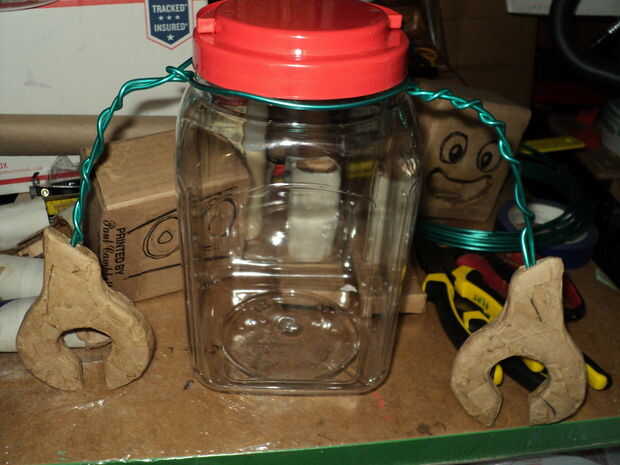 He añadido otro trozo de alambre para hacer un anillo que fue alrededor de la boca del envase. Los brazos podrían simplemente cuelgue fuera del contenedor y no estropear el aspecto de la película de plástico transparente.
