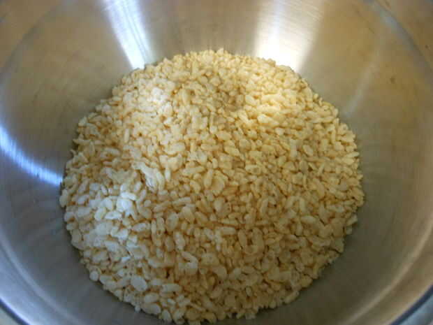 (Ser más inteligente que yo) rociar el recipiente con el aerosol de cocina antiadherente. Medir 6 tazas del cereal de arroz crujiente, en el recipiente.