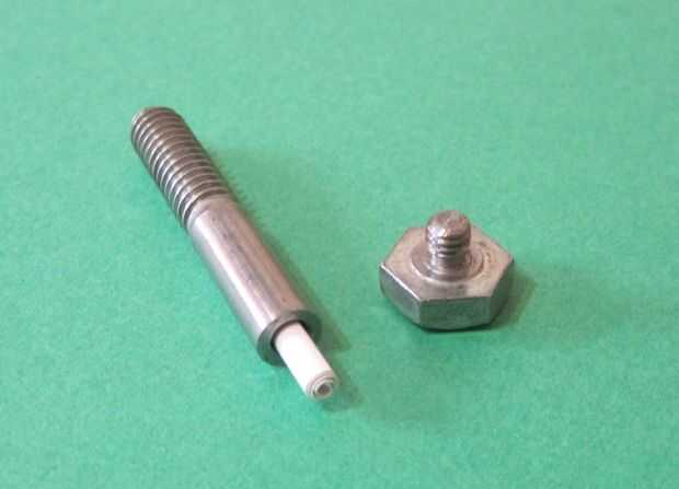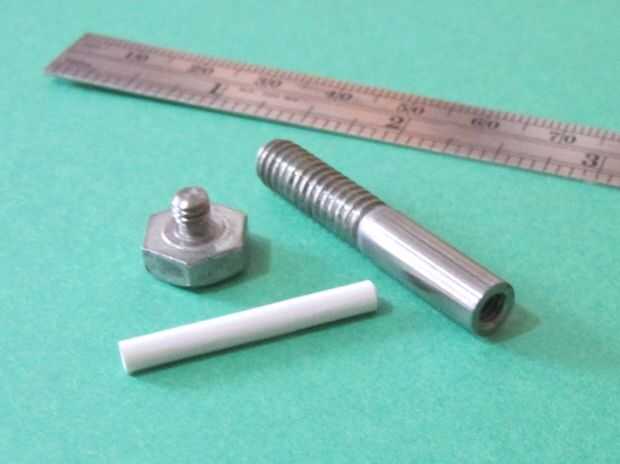 La cabeza entonces afianzado con abrazadera en la mandíbula 3 la caña sobresale. Bajar la caña a 0,15" por aproximadamente 1/4" de largo. Pequeños cortes son necesarios porque es sólo ser sostenido por la cabeza. Se añade una arboleda pequeña justo debajo de la cabeza para asegurarse que se asiente completamente montado. La caña entonces es roscada con el torno. Los hilos de rosca fueron perseguidos luego con un dado.