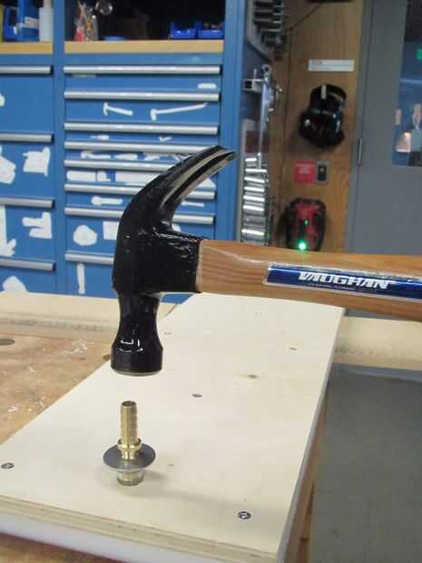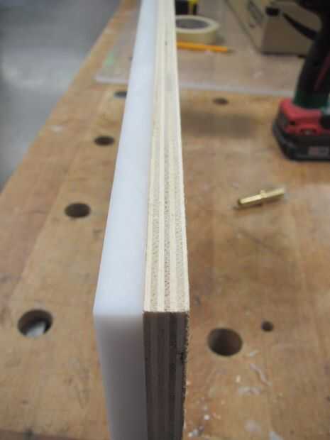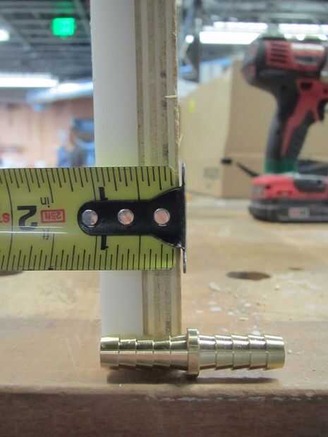 -Taladro con pala de directamente a través de la superficie de polietileno de alta densidad. El agujero de la madera contrachapada podría hacerse más grande para permitir la fácil penetración de la manguera. Sujete un trozo de madera a la salida del agujero para asegurar un corte más limpio.