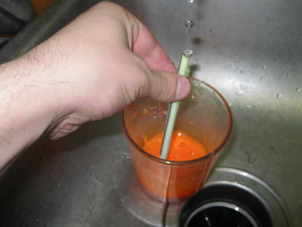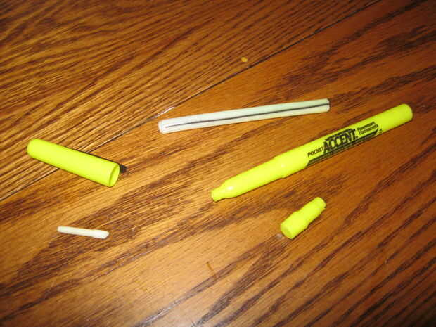Primero tomé un marcador (utilicé una fina porque son fáciles de abrir). Lo llevé aparte, teniendo cuidado de no romper nada. Enjuaga la punta hasta que era blanco y luego tomó el cartucho y pegado a la parte inferior en una taza vacía de agua y corría el agua del grifo en el otro extremo en un chorro fino. Esto aclara la tinta en el cartucho dentro de la taza de agua y lo diluye. No estoy seguro de la relación, pero sobre una taza de líquido es en la taza una vez que el cartucho está vacío.