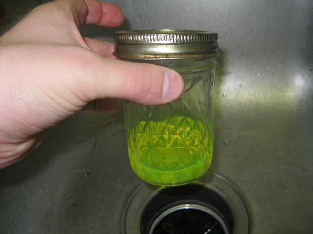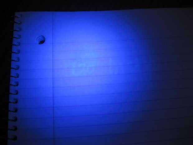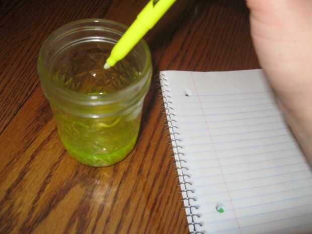 Entonces tomé la taza de líquido de enjuague el marcador hacia fuera y añadidas 3 gotas de detergente líquido. Esta mezcla se presentó lo mejor en el papel. La foto no hace a justicia. Bajo la luz negra todo el mensaje demuestra para arriba muy bien. Para impedir que crear arrugas en el papel como se seca la tinta, he usado papel de marcador (.20 centavos por hoja en la tienda de artesanía local). Sólo sumergir la punta del marcador de la tinta, golpéelo apagado y escribir.