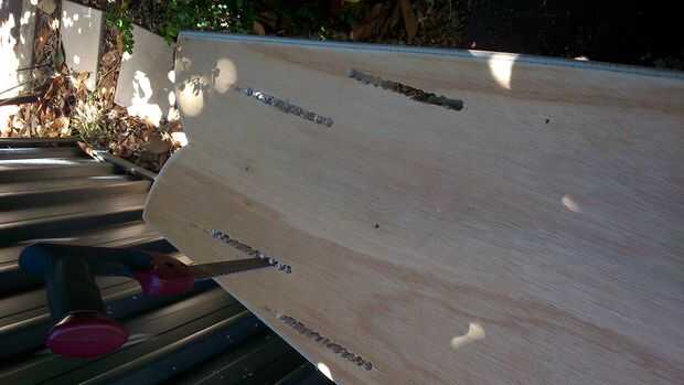 En madera tablas de surf (que son más gruesas que tablas) he hecho el hueco para la caja de aleta ser cincelado hacia fuera de un lado solamente sin embargo como una cometa Junta es mucho más delgada y la madera contrachapada es un dolor para cincel más fácil simplemente cortar el agujero para la caja de aleta completamente a través de la Junta.