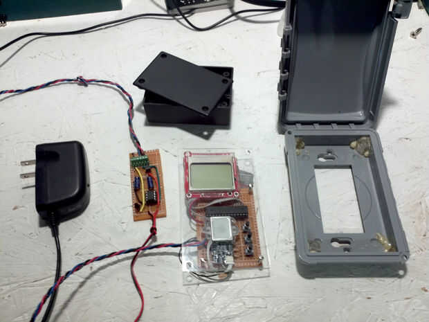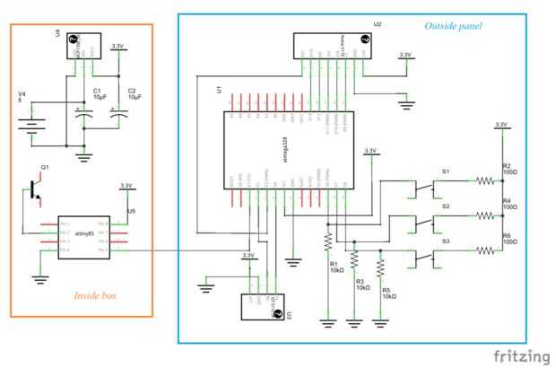 El sistema de apertura de la puerta consta de dos componentes: un panel de control en el exterior del garaje con el escáner de huella digital, una pequeña pantalla y algunos botones en una cubierta resistente a la intemperie; y una pequeña caja dentro del garage que se verifica cuando una huella dactilar reconocida ha sido explorada y abre la puerta y también convierte cualquier poder ofrecerle en 3.3 voltios. Un microcontrolador ATMega328p es el cerebro el exterior del panel de control, y un ATTiny vive en la caja dentro del garage. Las dos MCU comunican a través de una conexión en serie. Lo ATTiny prejuicios un transmisor para cerrar la conexión del interruptor de puerta de garaje cuando recibe una frase código específico sobre la conexión en serie. De esta manera un vándalo ligeramente inteligente puede romper en el garaje por estafando al panel de control y cruzar un par de cables.