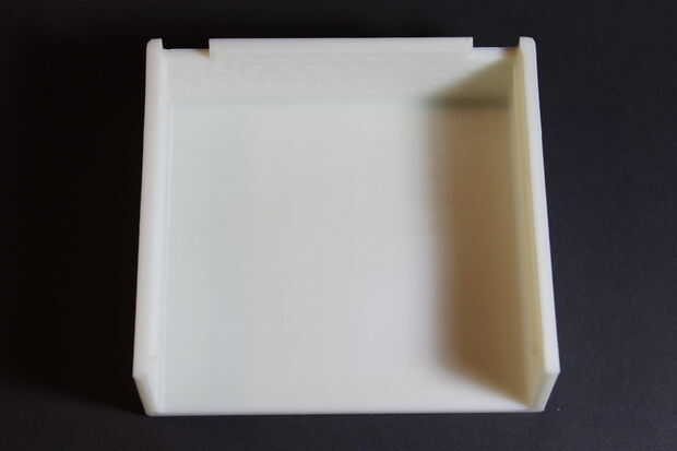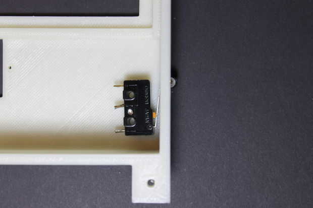 Entonces, todo se pega a la caja con pegamento caliente. El interruptor de límite se coloca con una ligera inclinación para facilitar la prensa.