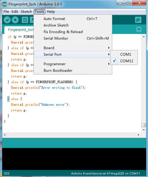 OK, hasta ahora, tenemos acabado la mayoría de hardware construir obra. A continuación debemos para instalar a nuestro cajón, pero antes de que tengamos una prueba para hacer seguro que puede funcionar perfecto! Así que ya es hora de vitalización proceso carga el programa en nuestra Crowduino, puede descargar el código y el archivo de biblioteca relacionados en allí. No te olvides de copiar el archivo de biblioteca de huella digital a la biblioteca de Arduino. Conectar el UNO al Crowduino a la computadora con un cable mini usb a continuación, seleccione el puerto adecuado, cuando su acabado de cargar, puede hacer una prueba como se muestra en nuestro video.