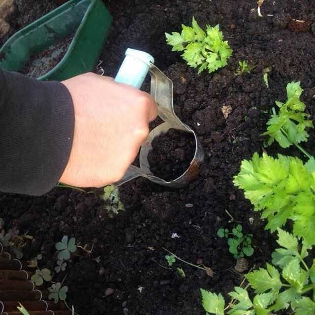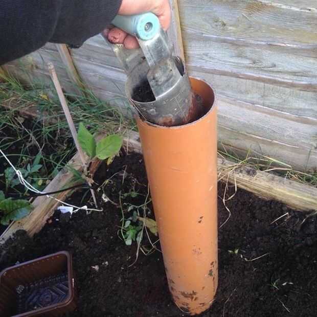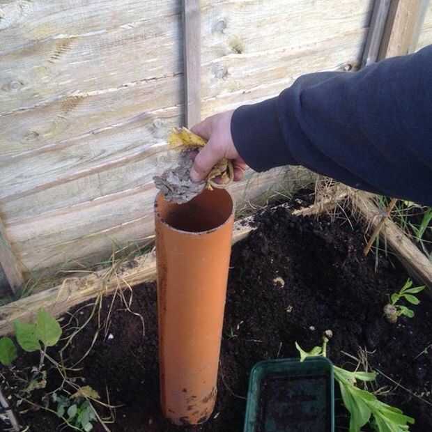 Usar algunos desechos de cocina para añadir a la parte inferior interior de la tubería seguida de un suelo. Utilizo mi herramienta de excavación para añadir el suelo en la parte superior