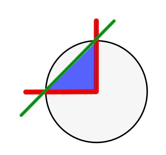Ya que sabemos el radio podemos trabajar el área del triángulo bordeado por las líneas rojas con la línea de 45 grados de verde. O en 3D, es la mitad el volumen del cubo. ¿Sigue conmigo?