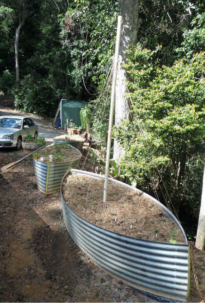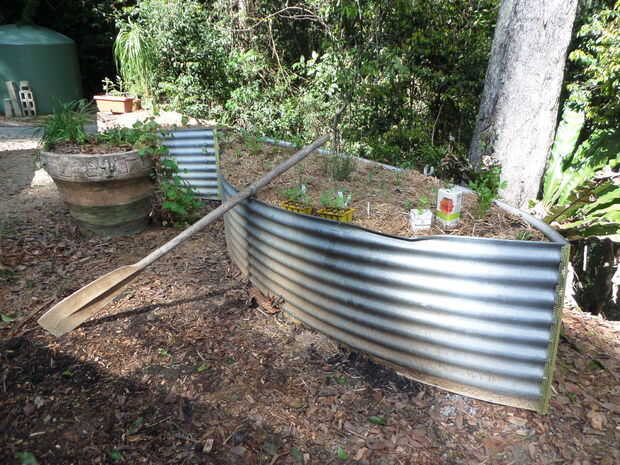 Que necesitábamos algunas trepadoras enrejados de habas y guisantes así que inserté una longitud de desecho de la pipa del PVC como un 'mástil' unido a un anillo de líneas de alta y trajo guita hasta los lados del barco. También hay una longitud de cadena viejo colgando de la parte delantera a la espera de un ancla.