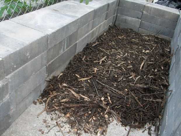 Paso 2.  Vierta una capa de mantillo de cama de concha acabada.  Jardinería en asfalto /concrete es posible pero es importante incluir estos próximos pasos necesarios para mantener la tierra contra el recalentamiento sobre el hormigón.