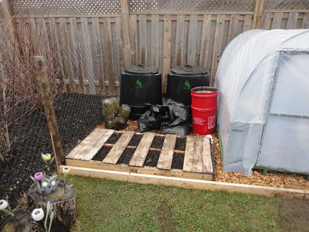 Tratando de no perder ningún espacio. Tengo 2 grandes composteros, 2 bolsas de caca de conejo y llegué del trabajo a tomar mi té de compost en un cubo de acero. El resbalón en la parte frontal está lleno de compost que voy a ser cada vez más lechuga. Las tablas son suficientemente anchos para caminar para llegar a la compostera.