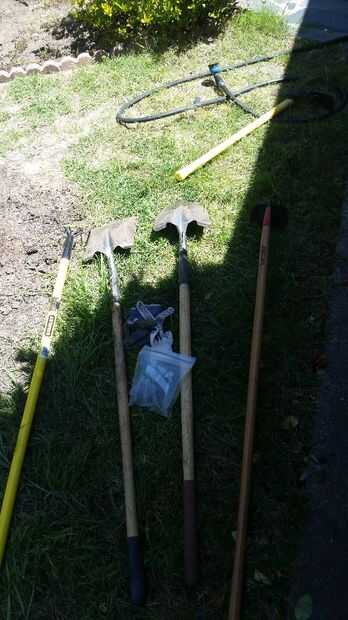 Este es mi nuevo huerto. Tratando de mantener limpio un ordenado para ir junto con el resto del jardín que estamos haciendo este año. Aprox. 500s/f. Todo es hecho por etc. de madera reciclada. Las fianzas de paja cuestan $4,50 cada uno, la lámina de