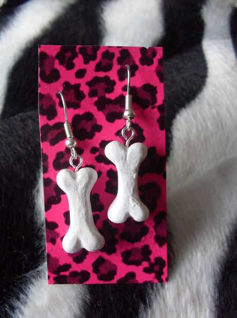 primer modelo de los huesos, entonces apreto un alambre de joyas en el barro por lo que cuando seca podría colgarlo de la cadena! entonces esperé que se seque, y luego Lijas para que tenga un aspecto más suave! luego os los adjunto a la cadena o la oreja cuelga! :D